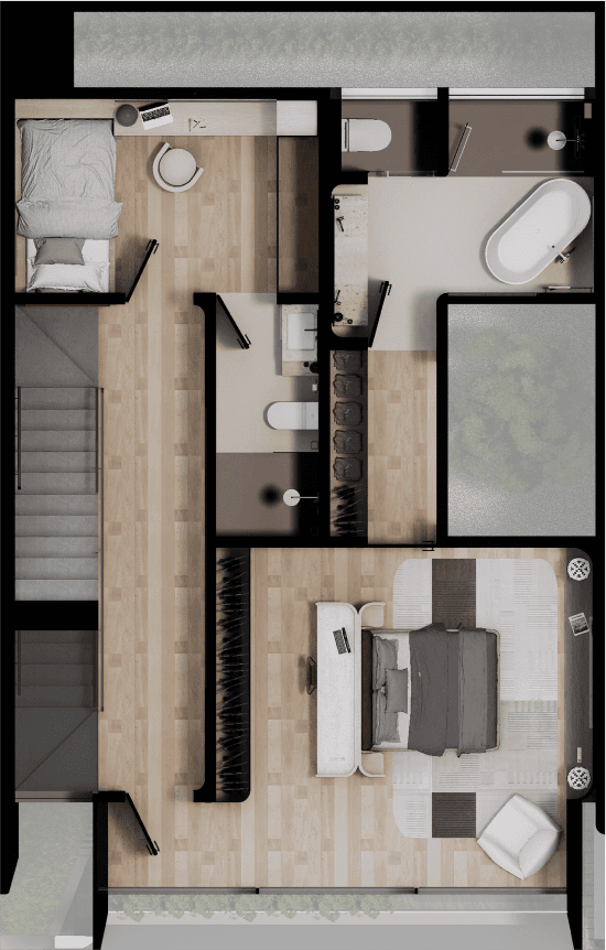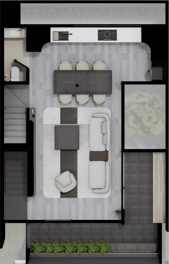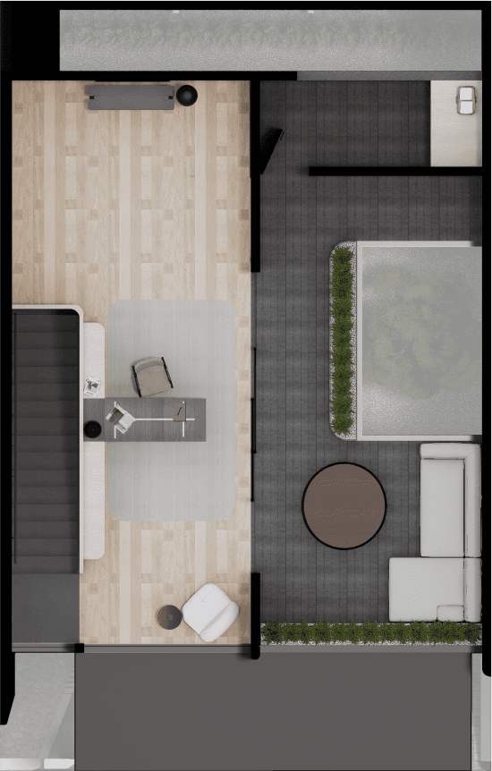 A bigger open plan stack concept makes living, cooking, eating, sleeping, exercising and working in perfect balance in a more even vast space.
